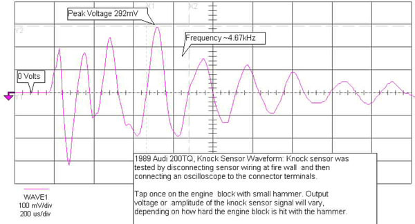 Oscilloscope Waveforms Ignition: ECU to Coil Driver at Idle Ignition: ECU to Coil Driver at 5000 RPM ![]() Ignition: ECU to Coil Driver, Engine off with Coil Driver disconnected (no load) Knock Sensor Waveform Inductive Pickup Sensor: TDC Signal at 3000 RPM, Note the increase in amplitude. Vertical Scale is 10V/Division, Horizontal Scale 2mS/Division Inductive Pickup Sensor: TDC Signal at Idle. Vertical scale is 5V/division, Horizontal is 2mS/division ![]() Inductive pickup sensors. TDC reference signal and RPM signal at idle. Vertical Scale is 5V/Division Horizontal Scale is 500uS/Division Ignition Signal at idle, primary side of the coil. Terminal 1. Note that the primary voltage spikes up to almost 250 V when the spark plug is fired. Copyright © SJM Autotechnik™ , all rights reserved Return to Trouble-Shooting page page. Return to SJM Autotechnik main page. |